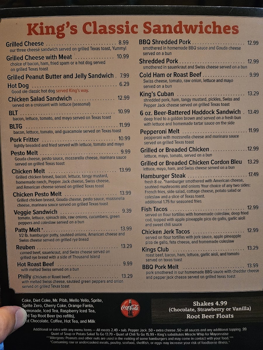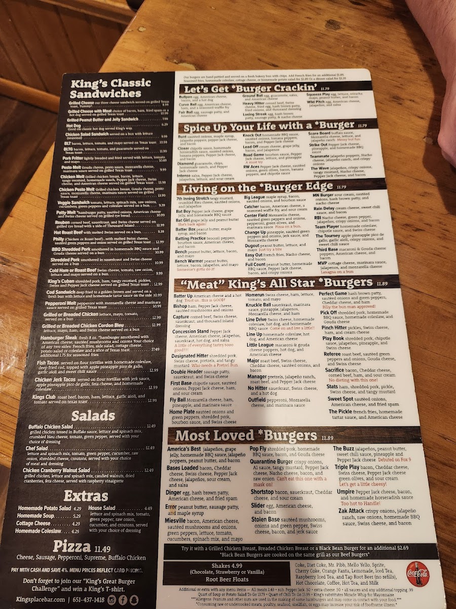 King's Place Bar and Grill offers a straightforward, comforting menu centered around classic bar and grill favorites with a special emphasis on burgers. Whether you're stopping by for a casual lunch or gathering with friends for a relaxed dinner, the menu presents familiar, hearty choices that fit the welcoming atmosphere of this local spot.